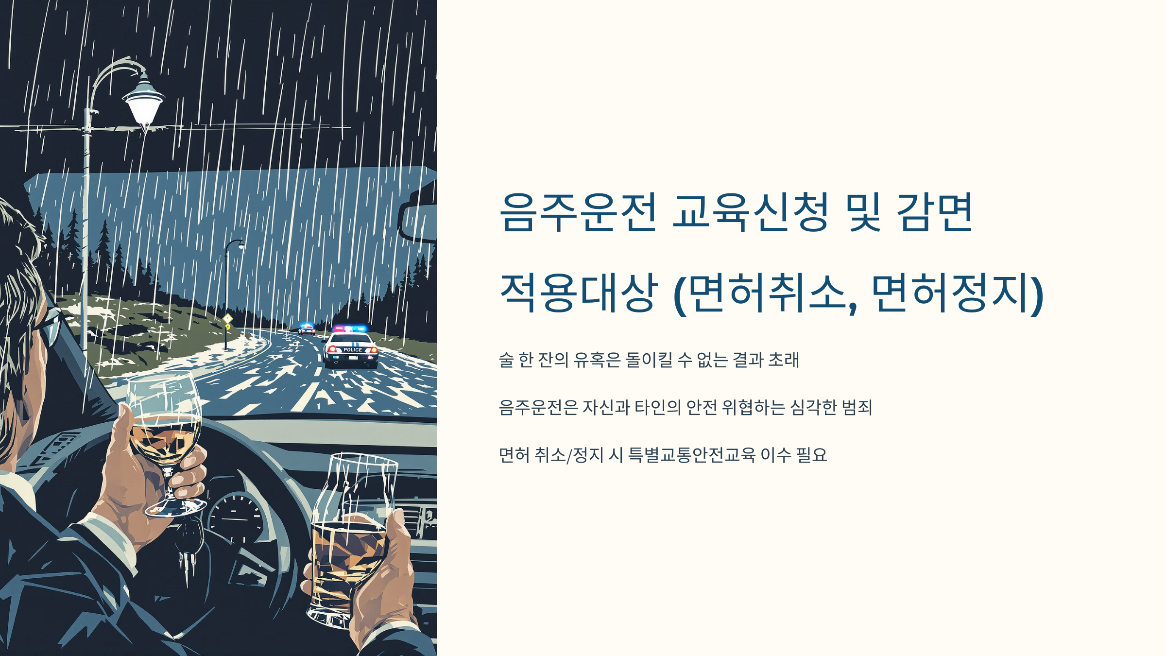 술 한 잔의 유혹은 때로는 돌이킬 수 없는 결과를 초래합니다. 특히 음주운전은 자신뿐만 아니라 타인의 안전까지 위협하는 심각한 범죄 행위입니다. 만약 음주운전으로 인해 면허가 취소되거나 정지되었다면, 특별교통안전교육을 이수해야 면허를 다시 취득하거나 정지 기간을 감경받을 수 있습니다. 이 글에서는 음주운전 교육 신청 방법부터 감면 조건, 그리고 면허취소 및 정지 대상까지 자세하게 알아보겠습니다. 음주운전의 위험성을 다시 한번 강조하며, 이 정보를 통해 조금이나마 도움이 되기를 바랍니다.